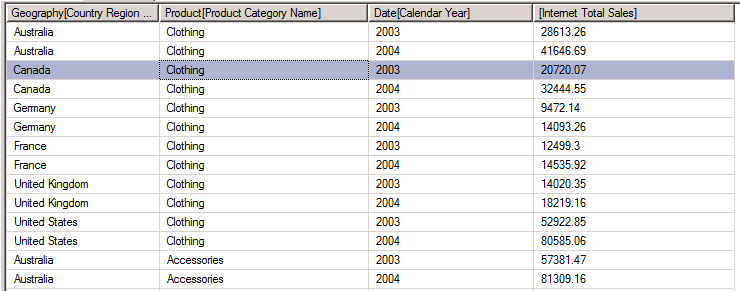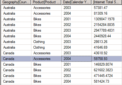 ORDER BY Geography[Country Region Name], Product[Product Category Name],’Date'[Calendar Year], ‘Internet Sales'[Internet Total Sales]