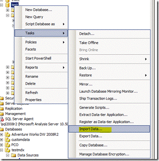 Connect to SQL Engine and Right Click on database where you like to import data from SSAS – Let’s say in my case I have a test database