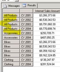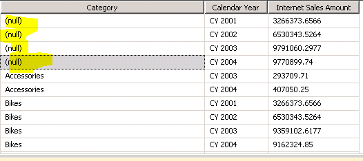 Important thing to keep in mind is “If a hierarchy has an ALL member and that member appears on an axis, this is represented in the flattened rowset by a row that has a NULL in every column that corresponds to a level below it”