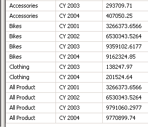 “Another behavior of the flattening algorithm is that the "[(ALL)]" level is not included in the dataset. This has a couple of implications. The first is that if you want to include data from the "All" member of a dimension, you’ll need to create a calculated member to represent this member as shown below: