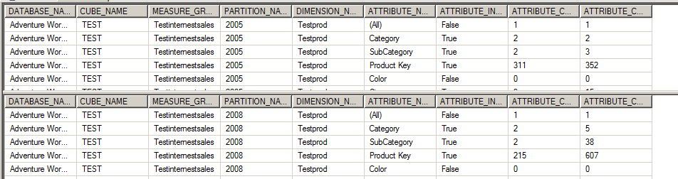 SELECT * FROM SYSTEMRESTRICTSCHEMA( $SYSTEM.DISCOVER_PARTITION_STAT , CUBE_NAME = ‘Test’, DATABASE_NAME = ‘Adventure Works DW 2008R2’ , MEASURE_GROUP_NAME = ‘Testinternestsales’ , PARTITION_NAME = ‘2005’)
